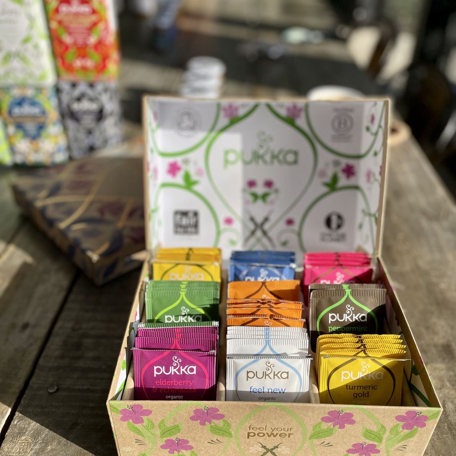 Caja de cartón con 45 bolsas de una selección de nueve variedades de infusiones Pukka. Estas variedades son peppermint &licoricce, night time, lemon ginger &manuka honey, love, feel new, supreme matcha green, elderberry echinacea, turmeric gold, three ginger