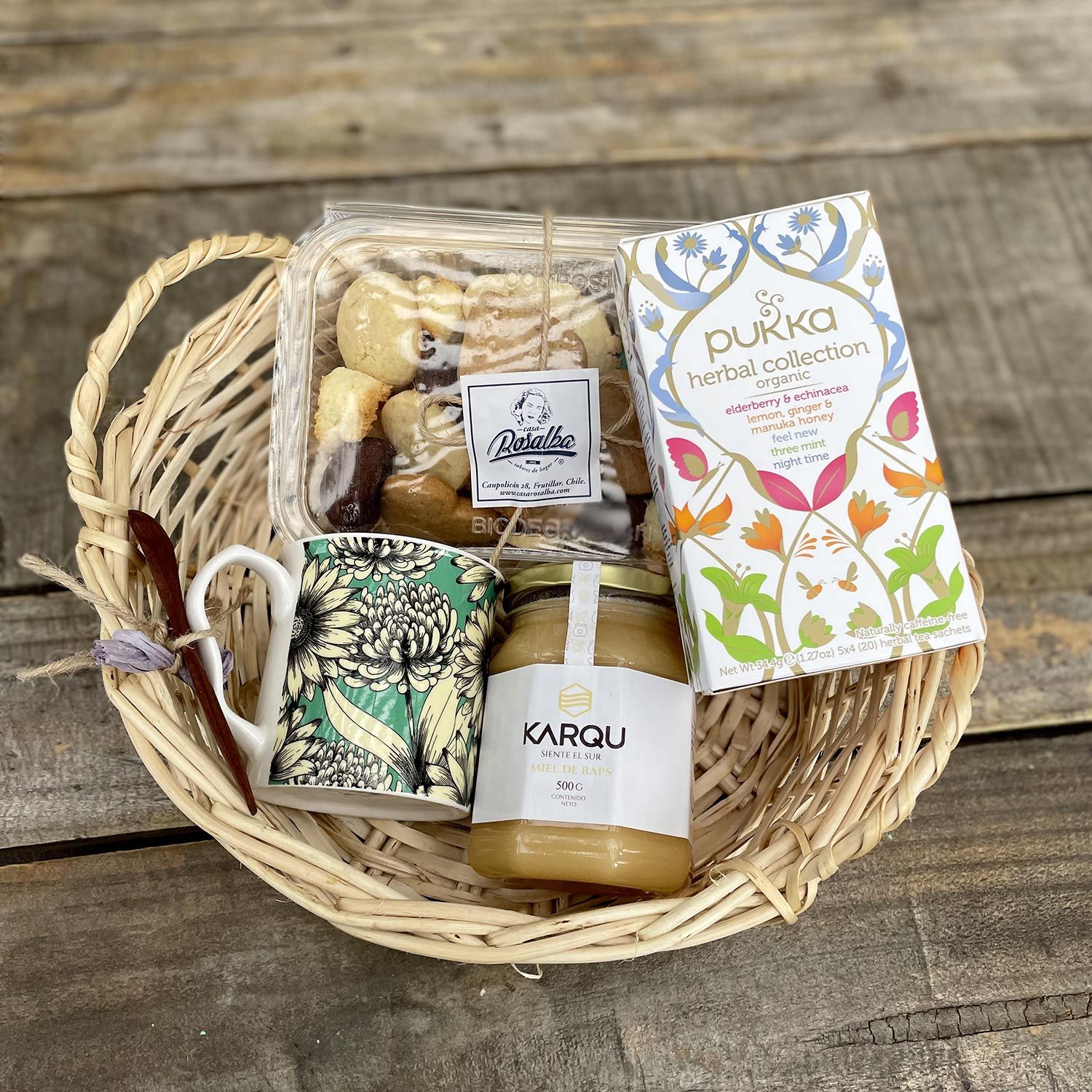 Canasto de regalo con miel de la zona de 500 cc, galleta caseras de 350 gramos en envase compostable, tazón de cerámica, cuchara de madera y caja de 20 bolsas de té Pukka o café Folks